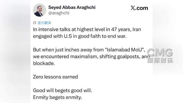 当地时间今天(4月13日)凌晨,伊朗外长阿拉格齐在社交媒体发帖指出,“在47年来最高层级的密集会谈中,伊朗本着诚意与美国接触,旨在结束战争。然而,就在距离达成‘伊斯兰堡谅解备忘录’仅剩一步之遥时,我们遭遇了(美方的)极限施压、不断更改的目标以及阻挠封锁。(美方)没有吸取任何教训。善意应换来善意。敌意将招致敌意。”